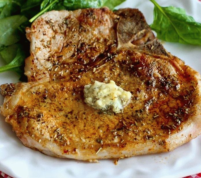 يمكن تحضير طبق سريع ولذيذ في المنزل الجدول عطلة من شرحات لحم الخنزير على العظام والأعشاب العطرية و زبدة الثوم.