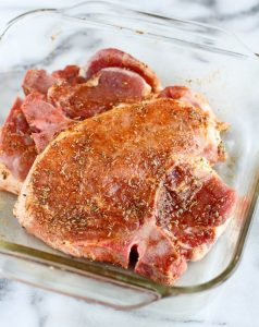 لحم الخنزير على عظمي ووضع في وعاء. في صغيرة في وعاء مزيج الزيت النباتي ، روزماري (¾ ملعقة صغيرة) ، الفلفل الحلو ، الملح والفلفل المطحون والحكيم المجفف. تصب في لحم الخنزير و تخلط بواسطة فرك اللحم.
