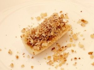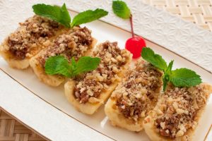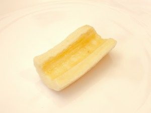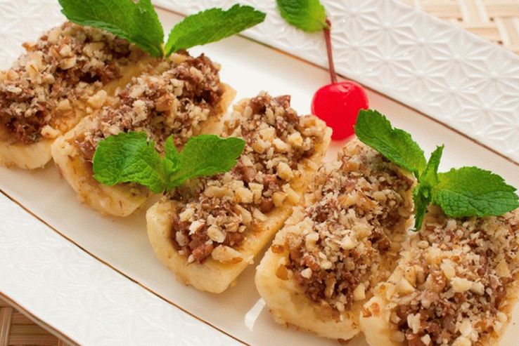 - اغسل الموز ، قشر ، مقطعة بالطول إلى قسمين نصفي وكل مرة أخرى إلى ثلاثة أجزاء.