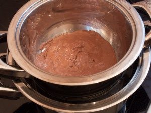 - نقسم الشوكولاتة إلى شرائح ، نضعها في مقلاة ، نذوب فيها حمام مائي يقلب من حين لآخر.