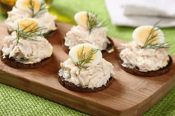 ضعي كمية صغيرة من السمك فوق دوائر الخبز المعكرونة ، وعلى ذلك وضع السمان المسلوق نصف قطع البيض. مقبلات الزينة مع الأغصان من الشبت.