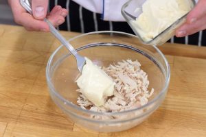 لحم السمك المدخن يوضع في وعاء عميق جيدا دلك بشوكة. ثم أضيفي المايونيز وعصير الليمون ، خلط كل شيء جيدا.