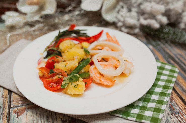 روبيان لذيذ وحبار مع سلطة دافئة سهلة طهي الطعام في المنزل ، أنصحك بإعداده لتناول العشاء مع كوب من النبيذ. لديك عطلة صغيرة!