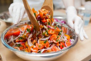 - قشر البصل الأحمر ومقطعة إلى القش رقيقة والطماطم اقطع الكرز إلى أرباع ، اقطع البقدونس.
