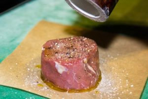 - تليين لحم البقر المتن مع الزيت النباتي ، الموسم الملح والفلفل.