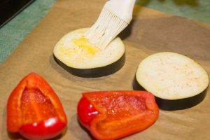 - يُقطع الباذنجان إلى شرائح ، ويُقطع الفلفل إلى شرائح. شحمهم بالزيت.