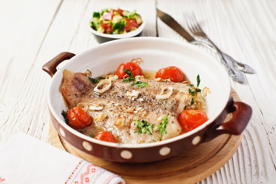 - اغسل وتجفيف ونقل فيليه السمك الى قالب ل الخبز. يضاف الملح والفلفل وعصير الليمون والزيتون النفط.