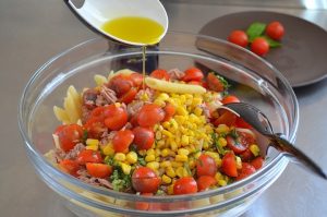 - يضاف الذرة المعلبة والريحان المفروم ، طماطم كرزية.