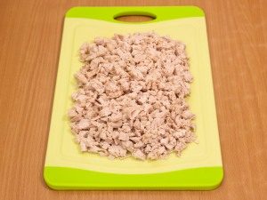 - قطع اللحم المسلوق المبرد إلى قطع صغيرة.