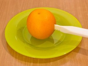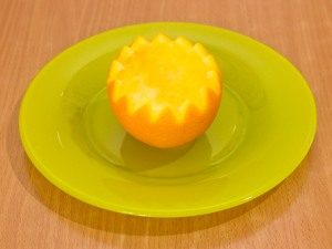 - اغسل البرتقال بسكين خاص أو عادي لعمل متعرج في دائرة ، قسّم البرتقال بعناية إلى قسمين.