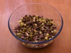 - في وعاء ، يخلط الكبد المفروم والجبن والخيار والخضار برفق ملح ، فلفل ، مزيج.