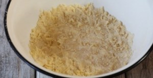 - نخل 200 غرام من الدقيق ، مخلوطًا مسبقًا في وعاء عميق مع مسحوق الخبز. طحن الزبدة على مبشرة بخير. أضف الزبدة للدقيق واعجن العجينة الكثيفة. لفه في فيلم ووضع مؤقتا في الثلاجة.