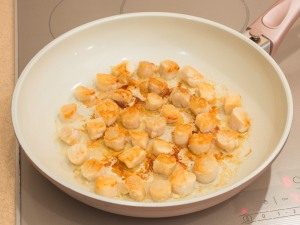 - صب الزيت النباتي في مقلاة ، والحرارة ، ووضع الاسكالوب ، يقلى على جانب واحد لمدة دقيقتين.
