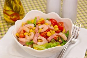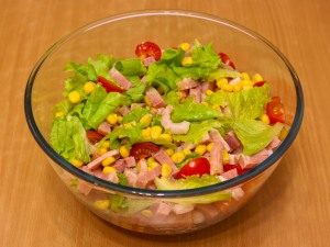 - المقبل وضع الطماطم ولحم الخنزير والروبيان والذرة ، حرك بلطف مع ملعقتين من الخس.