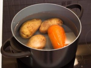 - اغسل البطاطا والجزر وقشرها حتى تصبح طرية.