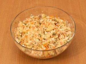 - يُسكب المايونيز ، يخلط كل شيء بلطف ، إذا لزم الأمر الموسم مع الملح.