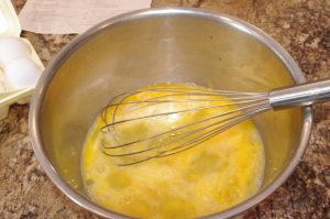 يُسكب الحليب في البيض ويُخفق بالخفق حتى يصبح صغيرًا رغوة.