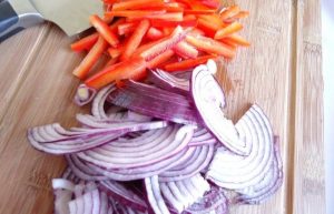 - الفلفل والطماطم مقطعة إلى شرائح والبصل – في نصف حلقات.
