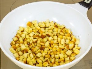 - يقلى مكعبات الرغيف في مقلاة بالزبدة حتى تصبح ذهبية البني.