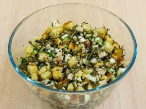 - في وعاء ، امزج اللحم مع البسكويت والخيار مع مكعب والبيض مع مكعب ، الأعشاب البحرية ، الموسم مع التوابل ، مزيج.