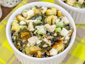 سلطة لذيذة ولذيذة مع عنصر غير عادي – البحر الملفوف ، الذي لا يحتاج إلى مقدمة. يكفي أن أقول أن عشب البحر يحتوي على مواد حيوية ل وظيفة الغدة الدرقية (التشاور مع الطبيب).