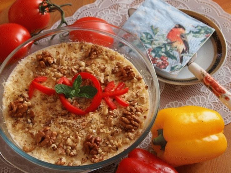 - يرش السلطة مع الجوز وإرسالها إلى الثلاجة ل نصف ساعة. نقوم بتزيين السلطة الجاهزة حسب تقديرنا ونعمل عليها الجدول.