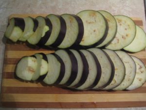 - اغسل اثنين من الباذنجان المتوسطة وقصها إلى حلقات (1.5 سمك سم).