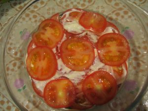- ضعي الباذنجان على طبق. تخطى شريحتين من الثوم من خلال الصحافة وانتشارها على قمة الباذنجان ، قم بتدهن الطبقة المايونيز. نقطع الطماطم إلى حلقات وننشرها على الباذنجان. تليين مع المايونيز.