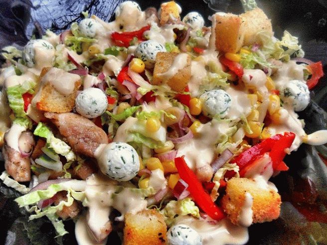 - تنتشر على صفيحة ملفوف ، ذرة ، مقطعة إلى حلقات البصل الأزرق ، الفلفل ، صب صلصة السلطة ، وضعت على القمة خبز محمص وكرات الجبن. شهية طيبة!