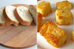 - كروتونس – رغيف الأمس. قطع القشور وفرك بالثوم ، يرش مع الأعشاب بروفنسال ، المسيل للدموع إلى قطع ، رش زيت الزيتون ولمدة دقيقتين ترسل إلى الفرن.
