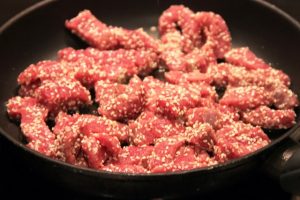 - نقطع الدجاج إلى شرائح. خلط الملح والفلفل وبذور السمسم لفة الدجاج في هذا الخليط. يقلى لمدة 5 دقائق ، باستمرار تحريك اللحم ليكون داخل العصير.