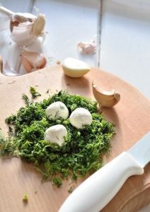 - نصنع كرات الجبن. مزيج جبنة الجنين ، الشبت ، الريحان و الثوم ، بالارض في الثوم. إضافة القليل من كريم ل الاتساق الناعم.