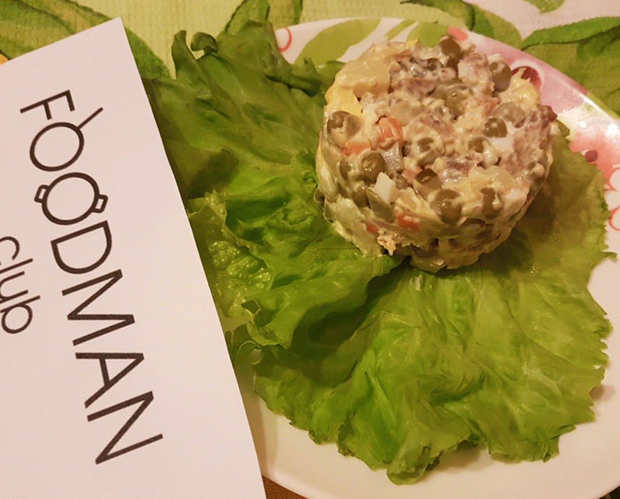 سلطة لذيذة كلاسيكية “Olivier” ، مطبوخة في المنزل مع لحوم البقر والتفاح ، وسوف ترغب في ذلك.