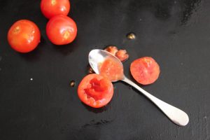 نحن نقطع طماطم الكرز على الأغطية ونخرج اللب بالبذور ملعقة صغيرة. اترك اللب واستخدامه للطهي أطباق أخرى.
