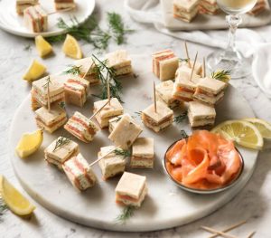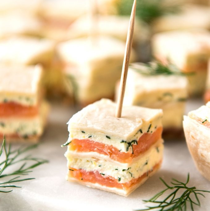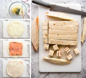 جميلة ومذهلة المقبلات التورتيا التورتيا ، سمكة حمراء مدخنة ، جبنة كريمية حامضة مع إضافة الشبت ، وإعداد في المنزل للطاولة احتفالي.