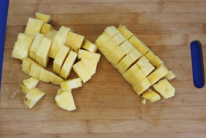 - يتم قطع الأناناس إلى قطع صغيرة. نضعهم بها النظارات.