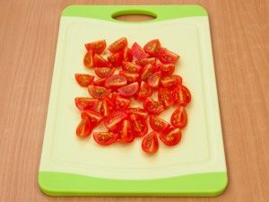 - تحضير المكونات ، وقطع اللحم إلى شرائح ، والكرز تنقسم إلى أربعة أجزاء ، تقطع الخيار إلى شرائح ، الفجل – لوحات رقيقة.