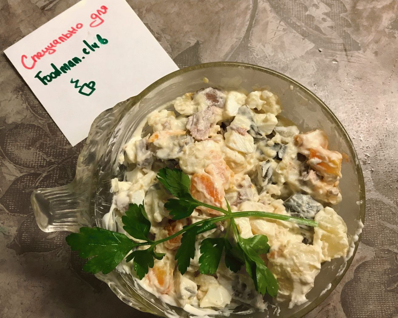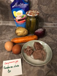 - قشر الجزر والبطاطا المحضرة ، اقطعها جيدًا. قطع خيار مخلل ولحم البقر والبصل والبيض – نقطع جميع المكونات بدقة! نضيف سلطة المايونيز.