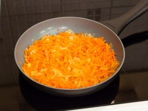 - يقلى البصل المفروم في مقلاة بالزيت ، ثم يقلى حتى ينضج مع الجزر.