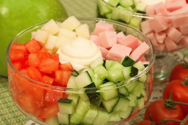 سلطة خفيفة وحساسة ولذيذة لاجتماع رومانسي. الاستعداد في المنزل سريع وسهل. يمكن استبدال لحم الخنزير بأخرى السجق العجاف ، على سبيل المثال ، باليك ، ولحم الخنزير ، والكربوهيدرات. أو، إذا سمح الوقت ، غلي الدجاج. اللباس مثل هذه السلطة يمكنك تذوق الكريما الحامضة أو المايونيز.