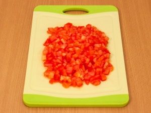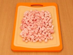 - قطع الطماطم والخيار والتفاح ولحم الخنزير إلى مكعبات صغيرة.