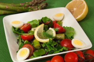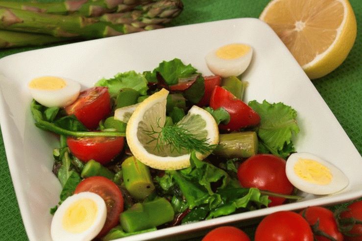 سلطة صحية ولذيذة مع الهليون. الهليون يمكن أن يكون مثل الأبيض والأخضر. إذا كنت لا تحب الهليون ، فيمكنك الطهي سلطة المنزل مع الفاصوليا الخضراء.