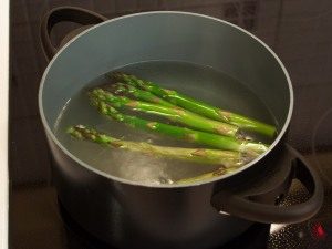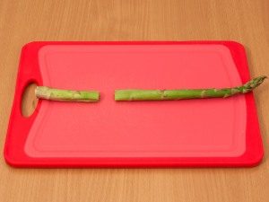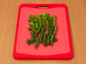 - قطع الجزء الثابت غير صالح للأكل من الهليون ، ضع الباقي في وعاء من الماء المغلي ، ويطهى لمدة خمس دقائق. الهليون المبرد مقطعة إلى قطع صغيرة.
