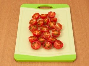- اغسل طماطم الكرز ، مقطعة إلى قسمين (طماطم عادية مقطعة إلى عدة شرائح صغيرة).