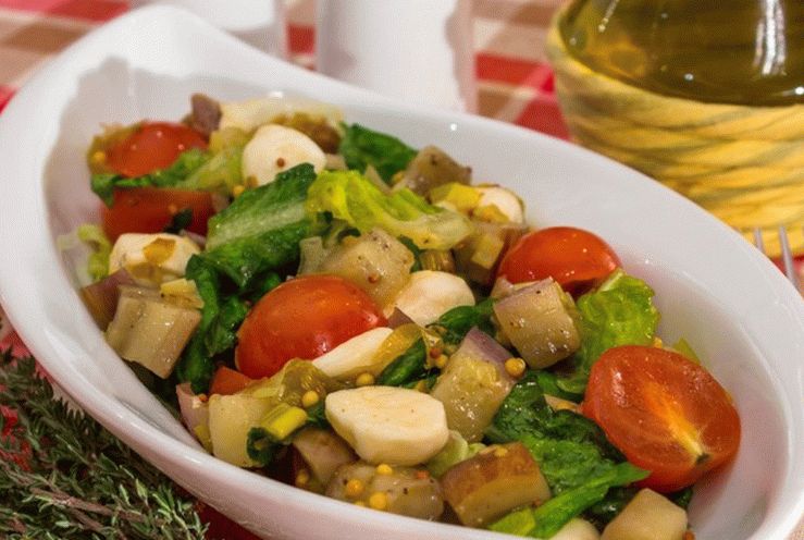 سلطة خفيفة ولذيذة وقلبية. وفقا لهذه الوصفة ، يمكنك اطبخ سلطة في المنزل ، واستبدل الباذنجان بالفطر.