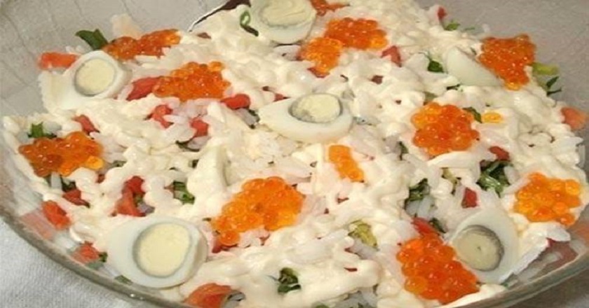 - تكرار الطبقة الأولى. تزيين السلطة مع بيض السمان و الكافيار الأحمر.