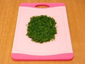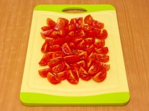 - قطع الفجل في لوحات رقيقة. الفلفل المقشر المفروم تقطيع الطماطم إلى شرائح صغيرة ، خضراء ختم ناعما.