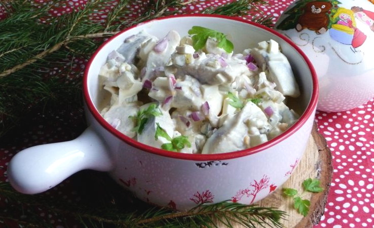 من الرنجة المملحة يمكنك طهي وجبة خفيفة لذيذة في المنزل الجدول عطلة. اخلطي قطع الرنجة مع البيض المسلوق ، المخللات والبصل والموسم مع المايونيز والقشدة الحامضة نحن نصر 2-3 ساعات.