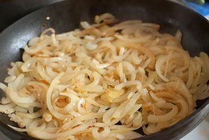 - يقطع البصل إلى نصف حلقات ويقلب على الدهون إزالتها من المرق.
