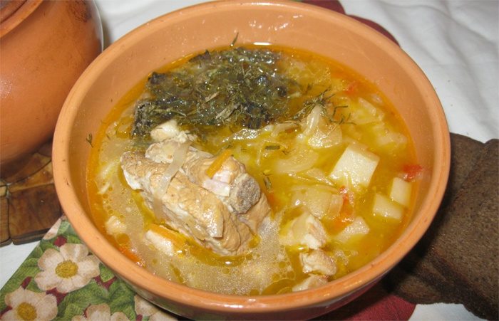 - أعد اللحم إلى الشوربة وضع الخضروات المقلية في مقلاة يطهى لمدة 15 دقيقة على نار خفيفة. أطفئ النار. أعط الحساء الوقوف تحت الغطاء لمدة 15 دقيقة الخضر.